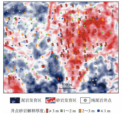 下载eps/tif图 图 10 井点砂岩厚度与地震振幅关系 Fig. 10 Relationship between well-point sandstone thickness and seismic amplitude |