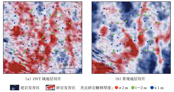 以大庆长垣萨尔图油田A小层局部发育单一河道砂体区域为例,如图 11所示,图中储层预测结果颜色由蓝→白→红变化表示岩性由泥岩向砂岩逐渐过渡,OVT域地层切片[图 11(a)]预测砂岩厚度2 m以上的井点与地震预测结果符合率超过70%,比常规地层切片[图 11(b)]预测的结果符合率提高了15%,而且预测出枝状的河道砂体,反映的砂体更加连续清晰。