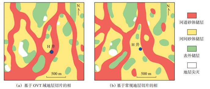 依据图 11(a)预测的储层砂体展布趋势,结合预测条带上及周边井点相应层位砂体的解释厚度、测井曲线形态等对比确认[29-32],刻画出沉积微相图[图 12(a)],按照同样的方法根据图 11(b)刻画出图 12(b)。以注入井H井为例,按图 12(b)的刻画结果,该井分布在席状砂体中,统计该区A小层120口分布在席状砂体内的水井日均吸水量7 m3,而实际上H井在A小层的日均吸水量为15 m3,两者存在明显的差异,开发动态数据统计结果与对该井的地质认识存在矛盾,而按图 12(a)的刻画结果,H井分布在河道砂体中,统计研究区A小层96口分布在河道砂体内的水井日均吸水量为14 m3,和H井的实际吸水量非常接近,说明H井在A小层应分布在河道砂体内。由此可知,以基于叠前OVT域地层切片预测的储层砂体展布趋势为依据的相图精度更高。