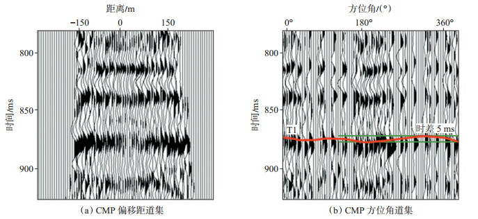 与动校正过程中速度过高或过低导致的同相轴随炮检距变化而下弯或上翘现象不同,在按炮检距大小排列的CMP道集中,同相轴呈现参差不齐、随机跳动现象的特征[图 2(a)],而且这种情况很难判断是哪些因素引起的,因为噪音干扰、静校正不准确以及方位速度差异都有可能产生类似的现象。将动校正后CMP道集按方位角大小进行排列,可知,同相轴随着方位角起伏变化[图 2(b)],起伏时差可高达5 ms,其起伏变化具有一定的周期性,当方位角相差180°时,相当于检波点和激发点位置进行了互换,地震射线路径未发生改变,反射时间基本一致,即其变化周期大约为180°。