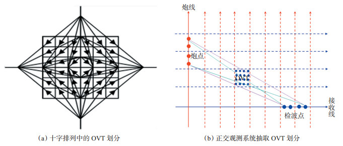 十字排列可由正交观测系统抽取出来[图 4 (b)],即把来自同一炮线和同一检波线的所有地震道集合起来,因此十字排列的个数与炮线和检波线交点的数目一样多,每个OVT都是沿炮线有限范围内的炮点和沿检波线有限范围内的检波点构成,这2个范围把OVT的取值限制在1个小区域内,OVT可以限制炮检距和方位角的范围。
