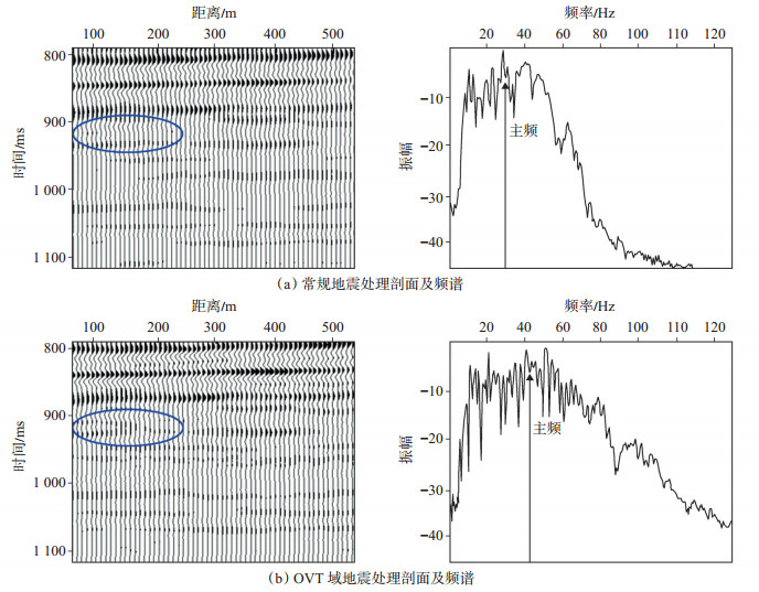 常规地震处理技术采用多次叠加的方法,多次叠加的平均效应消除了地震数据中随不同的方位角和炮检距变化的储层各项异性信息,无法把这些信息用于地震解释和储层预测,而叠前OVT域处理技术采用单炮次或部分叠加方法,充分保留了反映储层方位各项异性的方位角和炮间距信息。如图 6所示,与常规地震处理剖面及频谱对比,OVT域地震剖面上同相轴数量增多(图中蓝色圈所示),地震资料频带更宽,主频更高,地震分辨率更高,反映储层不同方位的有效信息加强[13-14]。