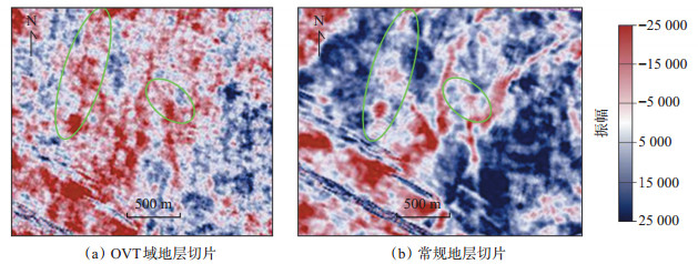 从成像效果对比分析来看(图 7),常规地震属性信噪比高,地层切片反映储层较清晰,但与OVT域地层切片相比,有些储层信息没有预测出来(图中绿圈所示)。OVT域地震资料与常规地震资料相比,优势在于能够从不同方位反映储层有效信息,最大限度地保留地震信息的有效性,提高储层预测的精度。