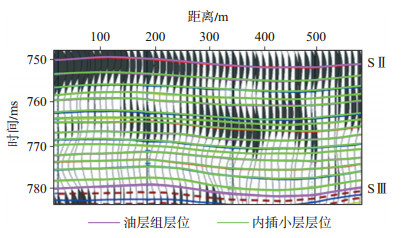 2.3.1 等时地层格架建立利用地层切片技术预测储层的基础是建立等时地层框架[20-22]。研究区构造平坦,目的层段无缺失或地层尖灭,地震资料显示油层组级地层同相轴稳定、连续,油层组与小层级地势形态基本一致,井震标定相关性达85%以上。通过地震合成记录标定和地震同相轴追踪,建立相对较厚时间域的油层组级等时地层格架,然后以油层组SⅡ,SⅢ等时地层格架为约束,在油层组内部按照井点分层的等比例原则建立沉积单元级地层格架(图 8)。所得分层与实际井点分层深度误差在±1 m内的井达90%以上,精度得到了保证,为后续相应沉积单元的储层预测精度提供了保障。