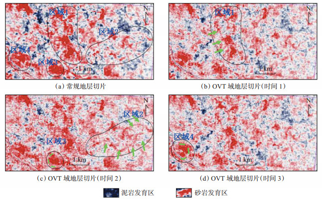 研究区工区面积20 km2,目的层为分流平原亚相沉积,复合河道砂体和点坝砂体发育[1]。利用上述方法建立全区地层格架,在多个含有不同方位、炮检距的地震数据体中的一定时窗内提取相应层位的地震样点值,实现多个地层切片的制作[23-26]。不同方位角体和常规地震体预测同一小层(基于振幅属性),预测储层整体趋势基本一致,但方位角体整体连续性更好,砂体边界更清晰;不同方位角体预测结果存在细节上的差异。如图 9所示,选取4个区域应用地貌学特征进行详细对比分析,其中区域1为复合河道砂体发育带,OVT域地层切片与常规地层切片[图 9(a)]相比,识别出了单一河道砂体[图 9(b)中绿色箭头所指];区域2为窄小河道砂体发育带,OVT域地层切片预测的河道砂体更加连续[图 9(c)中绿色箭头所指];区域3和4为点坝砂体发育带,OVT域地层切片预测的点坝砂体边界更清晰[图 9(c),(d)中绿色弧线所示]。