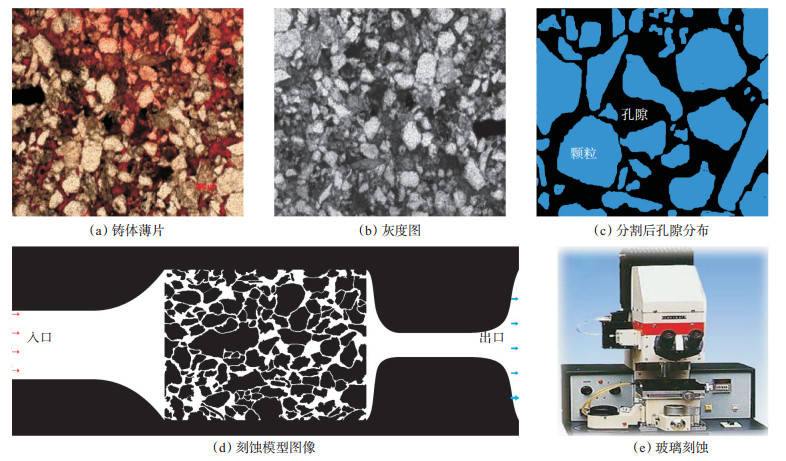 1 玻璃刻蚀驱替实验方法 1.1 玻璃刻蚀模型制备在油气田开发实验中所采用的微观模型种类很多,微观玻璃刻蚀模型是微观模型中常用的模型之一。本文基于岩心铸体薄片照片构建玻璃刻蚀模型,如图 1所示:第一,将岩石铸体薄片[图 1(a)]在ImageJ软件中转换为灰度图[图 1(b)];第二,将灰度图在Avizo软件中作分割处理,划分出孔隙和岩石颗粒[图 1(c)];第三,基于分割图在Coreldraw软件中绘制刻蚀模型图像[图 1(d)];第四,将刻蚀模型图像刻蚀到玻璃上,制作玻璃刻蚀模型[图 1(e)]。微观玻璃刻蚀模型的制备工艺(尤其是光刻技术)直接决定了玻璃刻蚀模型的精度,进而影响渗流实验的结果。由于目前光刻技术主要应用于光电技术领域,在油气资源开发中应用较少,一些学者[38-40]在微观玻璃刻蚀模型制作理论与技术上做了深入研究,为微观渗流研究提供了理论指导。本文所采用的微观玻璃刻蚀模型制备工艺的具体操作步骤分3步:①清洗匀胶。打开真空泵,吸住清洗后的玻璃片;先在玻璃片上滴打底胶作为增粘剂;烘烤10 min后滴上光刻胶,匀胶30 s,得到一定厚度的光刻胶膜。此处采用底胶和刻蚀胶配合使用的办法,能有效防止刻痕浅和孔隙“V”形槽变形。②曝光显影。在烤胶板上进行前烘10 min,然后进行曝光;利用光刻机进行曝光,曝光时间为80~120 s;将曝光后的玻璃片,放入显影液中,显影时间为5 min,后烘时间为10 min。③刻蚀去胶。在烤胶板上后烘并封蜡,在酸蚀液中腐蚀5~15 min;溶解经光照后的光刻胶,获得刻蚀模型。
