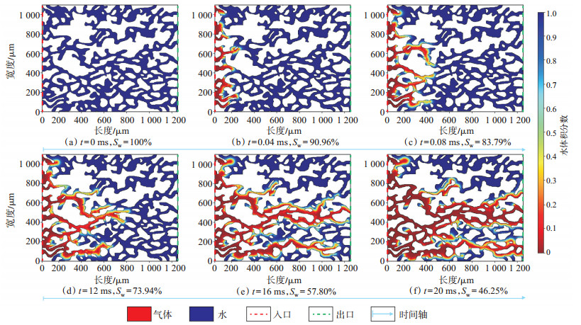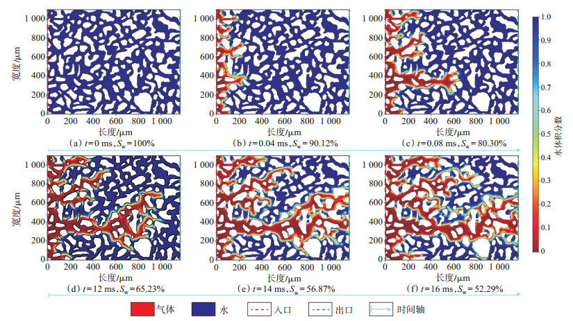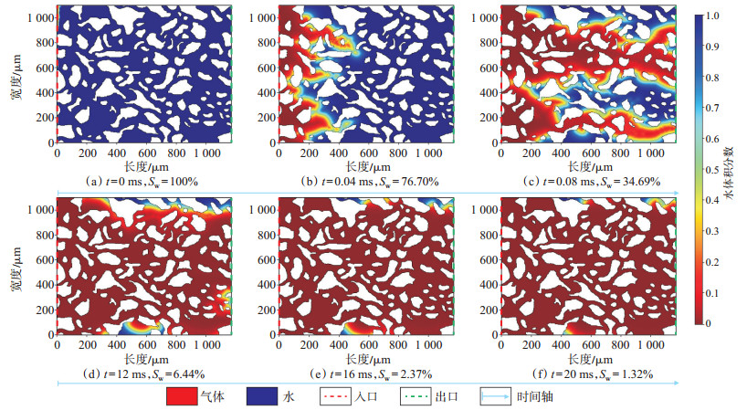 气驱水数值模拟实验过程中存在明显的微观指进现象,即气体沿着一条或多条阻力较小、由大喉道和连通孔隙组成的连续路径向前运移并率先到达出口(图 8—图 10)。模拟实验初始阶段,气体由左端注入,当驱替前缘到达模型左端时,模型中Ⅰ类、Ⅱ类、Ⅲ类储层的含水饱和度分别为34.69%[图 8(c)]、56.87%[图 9(e)]和57.80%[图 10(e)]。Ⅰ类储层模型比Ⅱ类和Ⅲ类储层模型具有更大的孔喉半径,驱替时间更快,当两相流界面前缘到达模型出口后,驱替范围继续变大(图 8)。由于Ⅱ类储层和Ⅲ类储层模型孔喉半径较小,毛管阻力较大,模型右端出口见气后,流动通道中的驱替阻力减小,被注入的气体基本沿着优势通道向前运移,波及范围不再扩大,驱水效率基本不再增加,指进现象更为明显(图 9,图 10)。