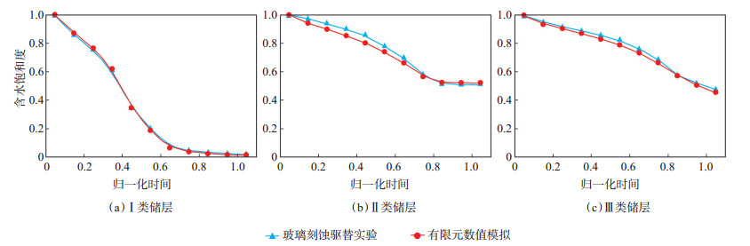 (1)归一化后的数值模拟结果与玻璃刻蚀驱替实验结果基本一致(图 11)。相同含水饱和度条件下,数值模拟与玻璃刻蚀驱替实验的两相流体界面前缘基本相同[图 6(h),图 10(e)],数值模拟和玻璃刻蚀驱替实验都存在明显的指进现象。当驱替前缘到达模型入口端时,Ⅰ类、Ⅱ类和Ⅲ类储层模型的含水饱和度分别为34.69%,56.87%和57.80%,这与图 11中曲线的拐点基本一致。数值模拟和玻璃刻蚀驱替实验中,Ⅰ类储层模型比Ⅱ类和Ⅲ类储层模型的孔喉半径更大,驱替时间更快。当两相流界面前缘到达模型出口后,Ⅰ类储层模型驱水效率继续增加,驱替范围继续变大,Ⅱ类和Ⅲ类储层模型驱水效率基本不再增加,波及范围不再扩大。