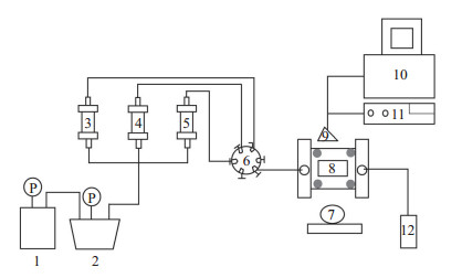 下载eps/tif图 图 2 气水两相流玻璃刻蚀驱替实验装置示意图 1.空压机;2.压力缓冲罐;3-5.中间容器;6.六通阀;7.光源;8.微观模型及加持容器;9.摄像头;10.采集电脑;11.录像系统;12.集液容器 Fig. 2 Schematic diagram of glass etching displacement experiment device for gas-water two-phase flow |