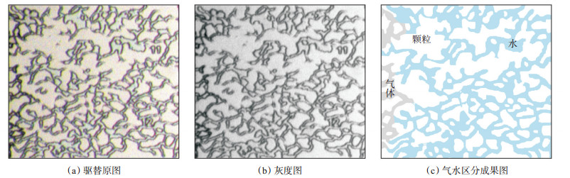 目前,基于微观玻璃刻蚀模型的驱替实验主要针对油水两相流开展研究,油和水的颜色差异较大,可以比较清晰地对实验过程进行观测[24, 27, 41-42]。对于气水两相流研究,气体和水的颜色相近,因此气水两相流体的界面不易观察。为了更好地观测驱替实验过程,采用亚甲基蓝染料对水进行染色,以区分水和气体(氮气)。准备好驱替模型和驱替流体后,即可开始驱替实验。驱替实验装置如图 2所示,具体实验步骤如下:①将微观玻璃刻蚀模型安装固定好,给玻璃刻蚀模型施加合适的围压,并对模型抽真空,再从入口端注入水(亚甲基蓝染色水)直至模型完全饱和水。②在24 ℃的恒温条件下,在入口端启动微量恒速泵,将初始驱替速度设置为0.05 mL/min,将气体(氮气)持续(20 min)注入玻璃刻蚀模型孔隙中。③当气水分布达到稳定状态后,逐渐加大入口端流量,分别以0.1 mL/min流量驱替20 min,0.2 mL/min流量驱替10 min,0.5 mL/min流量驱替5 min等,直至出口基本无水流出,驱替结束。整个实验过程中利用微摄像机拍摄实验过程的图像。