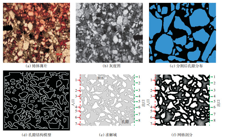 二维有限元模型构建(图 4)与玻璃刻蚀模型一样,也是基于岩心铸体薄片照片[图 4(a)],先经过灰度图转化[图 4(b)]和分割处理[图 4(c)]这2个步骤。有限元模型制作的第三步,是利用AutoCAD软件,基于分割后的孔隙网络图按照真实比例构建孔隙结构模型[图 4(d)];第四步是将孔隙结构模型导入COMSOL Mutilphysics软件来定义求解域[图 4(e)],模型左端为入口,右端为出口,闭合曲线所围区域为岩石颗粒,其余连通区域为孔隙和喉道,连通区域设置为求解域;第五步是采用自由三角形对求解域进行网格划分[图 4(f)],小喉道网格划分较为密集,大孔隙中间网格划分相对稀疏,越靠近孔隙壁网格划分越密集。