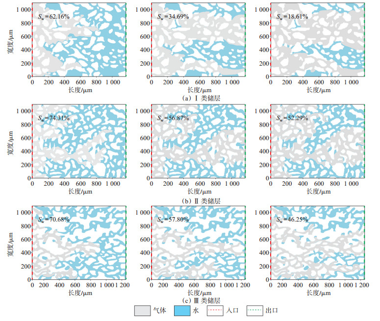 在气驱水实验中,由于孔隙和喉道的半径存在微观非均质性,不同孔喉半径具有不同的毛管压力,气体驱替时所受毛管阻力也不同,驱替前缘速度不同,存在明显的微观指进现象。即将气体由左端入口注入模型,当驱替压力大于喉道的毛管阻力时,气体率先通过喉道;当驱替压力小于毛管阻力时,气体先停止向前移动一段时间,然后发生运移跳跃;驱替前缘沿着毛管阻力较小的连通路径向前推进并率先到达出口,形成优势通道。当气体到达模型出口后,注入的气体多半沿着优势通道流动。从图 6可看出,Ⅰ类储层驱替前缘向前推进较为均匀,指进现象较弱,驱替效果较好[图 6(a)];Ⅱ类储层模型出口端见气时,含水饱和度为56.87%,最终含水饱和度为52.29%[图 6(b)];Ⅲ类储层模型出口端见气时,含水饱和度为57.80%,最终含水饱和度为46.25%,含水饱和度降低幅度较小,驱替效果差,指进现象较为明显[图 6(c)]。实验结束后,剩余水主要分布在小喉道、小喉道所控制的大孔隙及孔隙盲端。