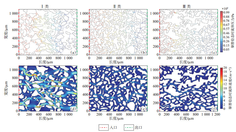 构建的Ⅰ类、Ⅱ类、Ⅲ类储层模型的尺寸分别为11.70 mm×10.98 mm,11.76 mm×10.97 mm,12.21 mm×10.93 mm。单相流数值模拟时,流体在恒压条件下从模型左端入口被注入到孔隙空间,气体首先占据大喉道和大喉道控制的孔隙,接着气体逐渐填充小喉道和小喉道控制的孔隙,随着时间的推移,模拟结果逐渐接近于稳态。如图 7(a)—(c)所示,模型中流体的压力从左(入口)向右(出口)逐渐降低,由于3类储层模型孔隙结构不同,毛管阻力不同,压力等值线分布也就不同。Ⅰ类储层模型中压力大于0.67 kPa的区域较大,Ⅱ类储层模型中压力为0.57~0.67 kPa的区域较大,Ⅲ类储层模型中压力为0.26~0.57 kPa的区域较大。Ⅰ类储层模型比Ⅱ类储层模型和Ⅲ类储层模型具有更大的孔隙半径,因此,它的压力沿着驱替的方向降低的最慢。如图 7(d)—(f)所示,在流速图中,蓝色表示低流速,红色表示高流速。通道中心处的流速比入口处的更大,越靠近孔隙壁流速越小。Ⅰ类储层模型的孔喉半径最大,所以毛管阻力更小,流动速度更大。