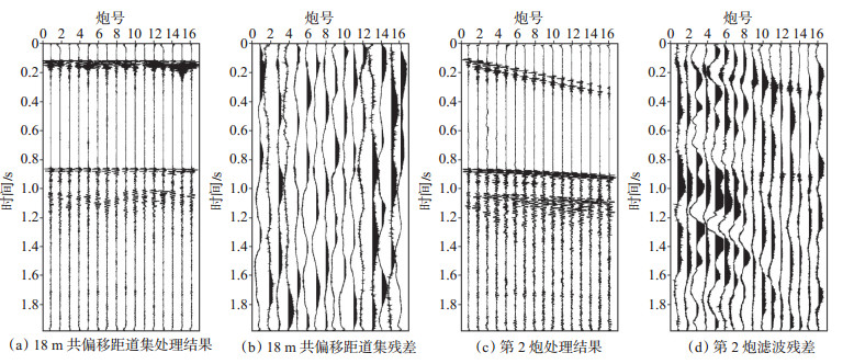 图 6为共偏移距道集中联合稀疏表示去噪结果。其中图 6(a)为共偏移距道集去噪结果,处理后信噪比提高4.364 dB。图 6(c)为去噪后第2炮,处理后信噪比提高3.972 dB,与图 5(a)和(b)比对可以看出,处理后道集同相轴连续性得到增强,随机噪声和涌浪噪声被抑制。图 6(b)和(d)分别为共偏移距道集和炮集滤波残差,剖面符合随机噪声分布规律,说明该方法能够有效利用信号、噪声空间分布特征的区别,多道数据同时参与计算,相当于增加约束条件,缩小解空间,减小多解性,准确反演出地下地层单位冲激响应,再由子波字典重构出地震记录,就能较好地实现信噪分离。