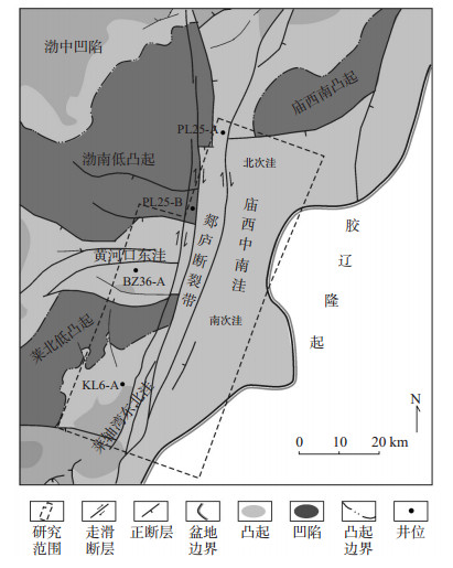 1 研究区概况庙西中南洼位于渤海海域的东南部海域(图 1),西邻渤南低凸起,东靠胶辽隆起,北邻庙西南凸起,洼陷呈北东向狭长形展布,面积约1 090 km2。研究区位于郯庐断裂东支南段,构造环境复杂,油气勘探程度低,钻井数量较少,且钻井多位于高部位,从揭示地层来看,目前仅2口探井(PL25-A井和PL25- B井)揭示了洼陷主力烃源岩,对研究区普遍存在的沙三段(Es3),特别是沙四段(Es4)主力烃源岩钻遇较少,导致对其烃源岩的发育状况与特征认识不清,极大地制约了该洼陷的油气勘探。