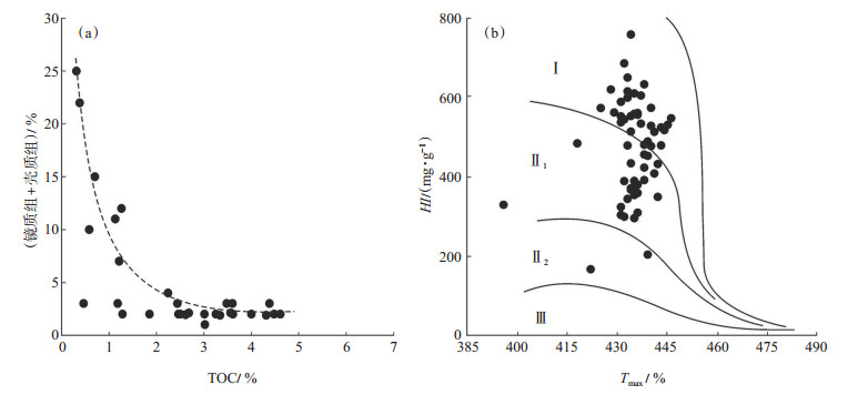 有机相的划分主要考虑烃源岩的有机质来源、沉积环境,以及干酪根类型等因素,然而,在实际勘探过程中,定性指标的划分往往难以操作和应用。为了建立有机相划分的定量指标,通过统计研究区烃源岩样品TOC与干酪根显微组分以及HI(氢指数)与干酪根的类型关系发现,随着TOC的增加,烃源岩有机质来源逐渐由陆源有机质向水生低等生物变化[图 2(a)];随着HI 的增加,干酪根类型由Ⅲ型渐变为Ⅰ型[图 2(b)]。TOC和HI 定量表征了烃源岩有机质来源和干酪根类型,因此将研究区烃源岩有机相的表征简化为TOC和HI 层段的划分,再结合沉积环境相关研究,可以较为完善地划分有机相。