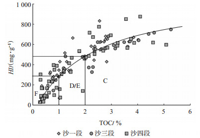 下载原图 图 3 庙西中南洼围区TOC与HI 相关关系统计 Fig. 3 Correlation of TOC and HI of source rocks in the study area |