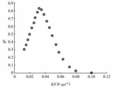 下载原图 图 4 庙西中南洼围区不同K 值对应拟合系数R2变化 Fig. 4 Variation of fitting coefficient R2 corresponding to different K values in the study area |