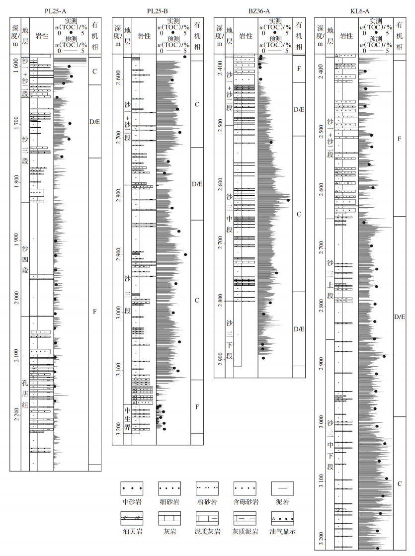 借助于泥岩纵向连续TOC数据,对沙三段烃源岩进行单井有机相划分,这样就实现了烃源岩非均质性的直观描述。从单井上看(图 5):C相烃源岩在PL25-A井区沙一段和沙二段均较为发育,厚度为42 m,沙三段和沙四段以及孔店组均不发育;PL25-B井揭示的C相烃源岩厚度最大,约360 m,沙一段和沙二段以及沙三段整体上为一套品质较好的烃源岩;BZ36-A井沙三中段烃源岩质量较好,C相烃源岩厚度为260 m,沙三下段烃源岩品质变差;KL6-A井沙三中下段烃源岩品质较好,C相烃源岩厚度为210 m,上部沙三上段及沙一段和沙二段烃源岩品质逐渐趋于一般。