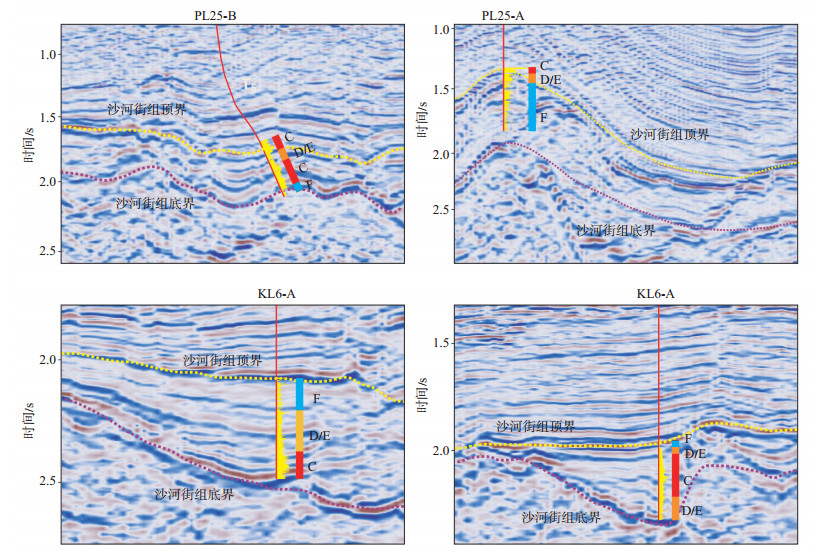 根据单井有机相划分结果,通过井-震结合,在地震数据格架下对各类有机相的地震反射特征进行了识别(图 6)。PL25-B井沙三段由上至下烃源岩有机相变化为C-D/E-C相,地震反射特征整体为中低频—连续—强振幅;PL25-A井纵向上烃源岩有机相变化为C-D/E-F相,地震反射特征由顶部的中低频—连续—强振幅逐渐变化为中高频—断续—弱振幅的特征;KL6-A井纵向上烃源岩有机相变化为F-D/E-C相,地震反射特征由顶部的中高频—断续—弱振幅,逐渐变化为中低频—连续—强振幅;BZ36-A井烃源岩有机相变化为F-D/E-C-D/E相,地震反射特征由顶部的中高频—断续—弱振幅,逐渐变化为中低频—连续—强振幅。可以看出有机相的变化与剖面上地震反射特征有着很好的吻合性,同时也明确了中低频—连续—强振幅是优质烃源岩即C相的典型地震反射特征。