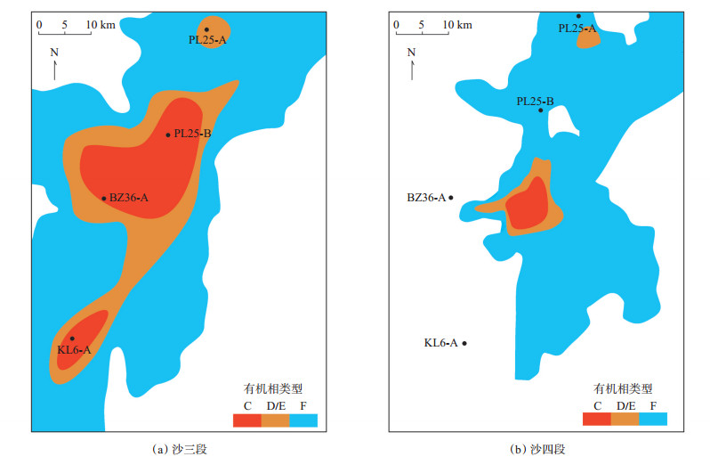 在地震数据格架下,根据单井标定识别的各类有机相的地震反射特征,综合考虑区域地层展布与沉积体系特征,对研究区沙三段和沙四段烃源岩展开了横向上的有机相追踪,刻画出各类有机相的展布范围(图 7)。