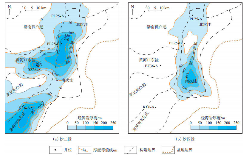 从已钻井烃源岩有机相(厚度)出发,在地震数据建立的地质格架下,根据烃源岩测井地球化学评价结果,综合考虑地层的厚度与沉积相,采用相关网格化成图软件编制出研究区沙三段和沙四段C相烃源岩(TOC质量分数大于2%)厚度图(图 8)。从图 8可以看出,沙三段C相烃源岩在庙西中南洼的北次洼、黄河口东洼及莱州湾东北洼广泛发育,庙西中南洼南次洼相对不发育;沙四段C相烃源岩分布相对局限,仅在庙西中南洼南次洼发育,其他地区均不发育。
