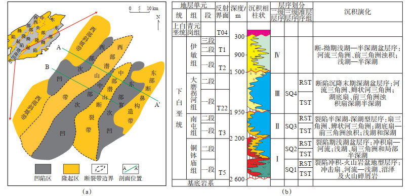下载原图 图 1 塔南凹陷次级构造单元划分(a)及沉积综合柱状图(b) Fig. 1 Division of tectonic sub-unit(a)and sedimentary column(b)in Tanan Depression |