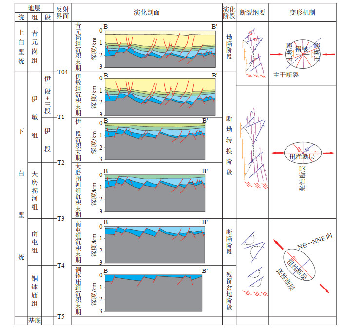 下载原图 图 3 塔南凹陷构造演化特征及断层变形机制 Fig. 3 Tectonic evolution characteristics and deformation mechanism of faults in Tanan Depression |