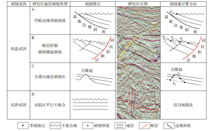 2.2 剥蚀量计算剥蚀量恢复在原型古地貌构建过程中十分重要,剥蚀量的计算方法有很多[29-30]。在井控地区,主要采用声波时差法,剥蚀量比较容易得到。无井控地区剥蚀量恢复工作是此次研究的难点。利用研究区三维地震资料,将地层剥蚀特征划分为4类(图 4):