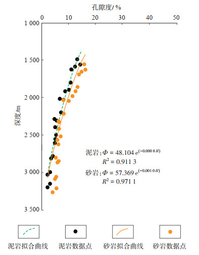 2.3 压实系数确定古地貌恢复工作中地层去压实校正是一项重要的基础工作。根据地层压实骨架模型建立孔隙度变化与深度之间的定量关系式,来恢复地层的压实厚度。不同岩性发生压实作用时存在一些差异,断陷湖盆中的泥岩、砂岩的初始孔隙度分别为52%和50%,经压实后可降到10%以下[33]。根据以往的研究成果[34-35],地层孔隙度随深度增加有规律地减小,孔隙度与深度之间存在以下关系