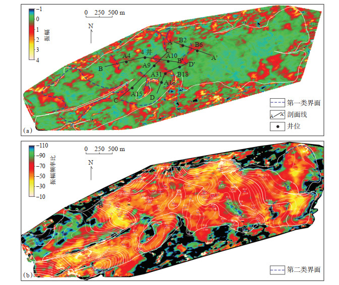 关于第二类响应的界面识别,通过提取多种属性,发现采用单一的振幅属性或频率属性,都无法在平面上很好地刻画该类界面,因此,考虑利用双属性融合技术来解决这一问题。通过文献调研,张京思等[18]、肖大坤等[19]、Sun等[20]在对薄河道砂体正演模拟过程中,发现在频率域中提取地震峰值属性可以较好地识别河道砂体边界。这里以本次研究砂体为例,进行该方法的应用说明。对于第二类响应的界面,虽然切叠处沉积点坝砂,但相对点坝砂主体来讲,在砂岩厚度、物性方面均差于后者,这种差异在地震记录上就必然表现为前者振幅值小于后者,前者频率值大于后者,尽管这种差异相对不明显。依据这一理论基础,可以考虑通过频率与振幅之比来对这种差异实现增益,从而实现对这种弱响应的放大识别(图 9)。