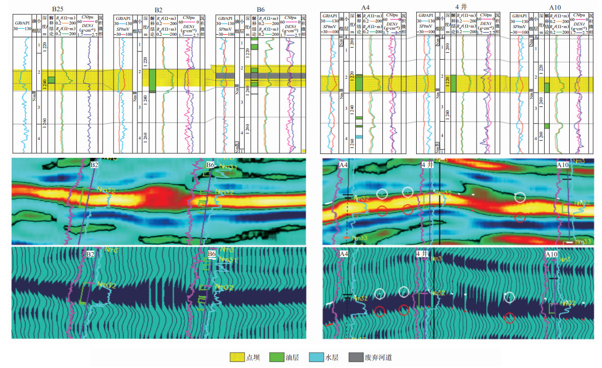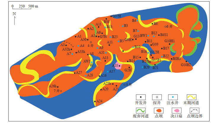 4 复合曲流带砂体构型解剖成果应用依据构型成果与动态资料验证,发现复合曲流带内部的切叠界面对流体具有侧向遮挡作用,切叠界面处保留下的泥质成分越多,遮挡效果越明显。因此,切叠关系中,切叠处以废弃河道沉积为主,则渗透性差,注水不见效;以点坝沉积为主,则渗透性中等,注水见效慢;不发育切叠界面区域,渗透性最好,注水见效快。基于这一认识,结合现有井网(参见图 11),建议在A34,A24所在点坝增加水平采油井,现有定向井转注;A7井西侧可部署水平采油井,利用西侧边水及东侧注水井A7,形成注釆井网;A27开层转注,与A15井形成完善注釆井网;B10井转注,与B9,B15井形成注水井网;A10井大泵提液,周边注水井增注。部分措施已初见成效,B10井已于2019年2月底转注,A10井4月换大泵提液采油,B9,B15分别于8月、9月开层采油,油井单井日产油由20~23 m3增加到43~46 m3,效果显著。