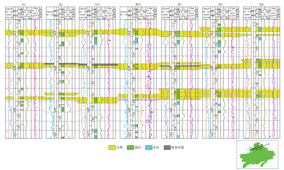 2 复合曲流带内部单河道砂体精细对比北区NmⅢ2为油田主力含油砂体,为复合曲流带沉积,具有分布范围广,切叠程度高的特点,井间河道砂体精细对比是该类砂体构型解剖的基础[11-12]。在单井微相识别基础上,通过区域等时界面拉平,根据超短期基准面旋回特征、河流下切模式等开展井间单河道砂体横向对比,将复合曲流带划分为多个不同的单一曲流河,砂体沉积以点坝为主(图 2)。
