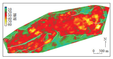 在井间单河道砂体精细对比基础上,以井上实钻单河道砂体厚度数据为主要依据,结合能够反映砂体展布形态的常规振幅属性(图 3)及曲流河沉积模式,利用petrel软件对目标砂体厚度分布进行预测,从而初步确定复合曲流带砂体整体分布范围(图 4)。