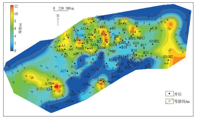 在井间单河道砂体精细对比的基础上,以砂体厚度分布、点坝定量公式作约束,以古地貌分析作流向指引,以剖面相分析结合多属性融合追踪与识别构型界面及其微相,最终实现了对整个复合曲流带内部多河道砂体平面分布的精细刻画(图 11)。