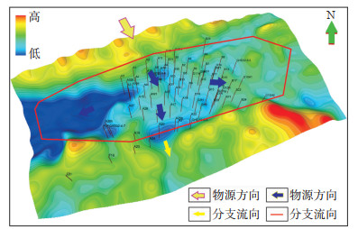 恢复渤海Q油田古地貌特征,对判断河流主要流向具有一定的指导意义[13-15]。结合前人研究资料,该区域物源方向为北西向,而NmⅡ油组顶面沉积的稳定泥岩层为研究区的主要标志层,可作为古地貌恢复的等时界面。在地震构造解释基础上,通过在时间域对NmⅡ顶面进行层拉平,从而恢复Nm Ⅲ沉积期的古地貌(图 5)。结果显示,在NmⅢ2复合曲流带砂体沉积期,该工区地貌表现为北高南低、中部平缓、东西构造继续变低的趋势,因此,初步判断水体流向应该是由北向南流入工区,再向西、南、东南等3个方向流出,向西与向东南为主要流向,该认识与NmⅢ2复合曲流带砂体的分布形态基本一致。