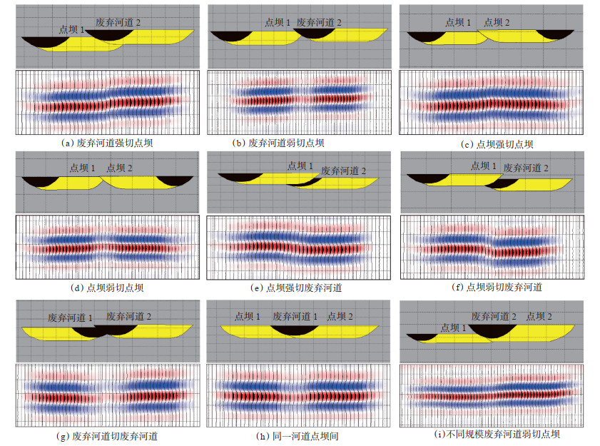 3.3.1 正演模拟结果通过对9种地质模型进行模拟,发现不同的切割关系在地震剖面上具有不同的地震响应关系,可以概括为2种主要的响应特征:①当切割程度弱或废弃河道互相切叠,切叠处以泥质废弃河道或薄的点坝边界砂沉积为主,切叠处与点坝主体间岩性差异较大,切叠处地震响应表现为振幅明显变弱,频率降低,并随着泥质成分增加,变弱的程度增大[图 6(b),(d),(f),(g),(i)];②当切割程度较强,切叠处沉积一定厚度的点坝砂,与主体点坝间岩性差异相对较小,切叠处地震响应表现为振幅变弱,但变弱幅度相对不明显[图 6(a),(c),(e),(h)]。