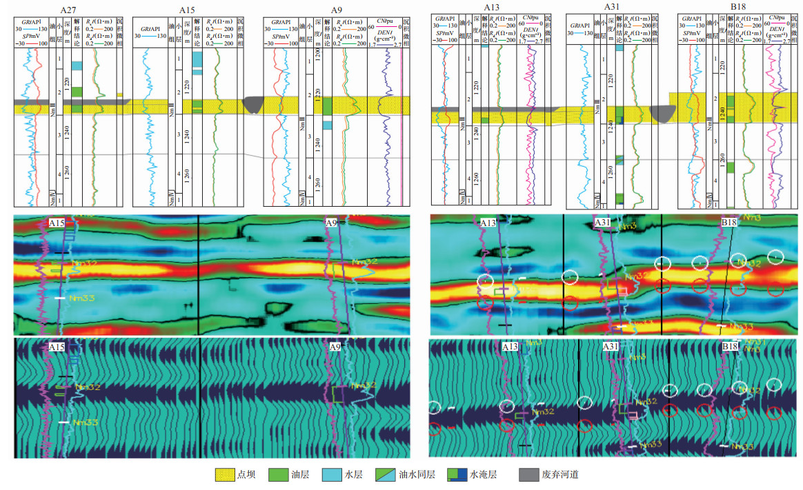 对于第一类响应的界面识别,采用提取多种地震振幅类属性,发现RMS属性、Maximum Trough属性、Mean Amplitude等常用的地震属性均不能全面地反映第一类切叠界面,主要是因为上述属性对点坝砂体的突出显示会削弱切叠界面处的弱响应,但是,通过平剖结合,多属性对比,发现Skew in Amplitude属性在识别振幅异常值时可取得比较好的效果,对弱振幅响应具有一定的放大识别效果,能够针对性的突出显示弱振幅响应。所以,采用该属性来识别第一类构型界面,在NmⅢ2砂体的中部、东部共识别出11条砂体切叠界面,同时,结合周边井剖面相分析及曲流河沉积模式,完成对切叠界面微相的识别(图 7-8)。
