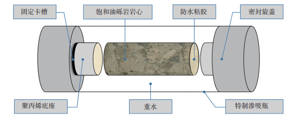 1 实验设计自发渗吸是多孔介质在毛细管力驱动下自发地吸入相对润湿相液体的过程。根据吸入的润湿相与排出的非润湿相的流动方向,渗吸现象分为正向渗吸和反向渗吸2种。在天然裂缝性油藏中,特别是当基质被裂缝中的水相环绕时,逆向渗吸通常是原油被采出的主要甚至是唯一因素[8-10],此时在裂缝性低渗砾岩储层中逆向渗吸成为渗吸采油的主要形式。对于渗吸研究,室内实验主要包括体积法和质量法,但由于岩心壁面上常粘附大量析出原油,导致2种方法均存在不同程度的系统误差。核磁共振方法能够直接测量岩心孔隙内部原油体量的变化,避免析出时粘附油滴等误差的影响,但实验时通常需要定期取放岩心,导致实验结果失准。为解决上述问题,设计了核磁共振专用渗吸瓶,进一步提高了渗吸实验的测量精度,并在此基础上开展了对玛湖砾岩岩心渗吸实验的量化分析。