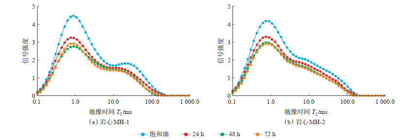 2 实验结果分析根据岩心核磁共振弛豫时间(T2)对孔隙孔径的划分方法[12-13],通常分为小孔隙(T2 < 10 ms)、中孔隙(10~100 ms)和大孔隙(T2> 100 ms)等。分析MH-1和MH-2这2块岩心渗吸实验及核磁共振T2谱曲线(图 2),其孔隙以中、小孔隙为主。根据饱和油T2谱曲线计算,在这2块岩心中,小孔隙含油量分别为77.8%和79.8%,中孔隙含油量分别为22.2%和20.2%,二者渗吸72 h后扫描的T2谱曲线均不再变化。