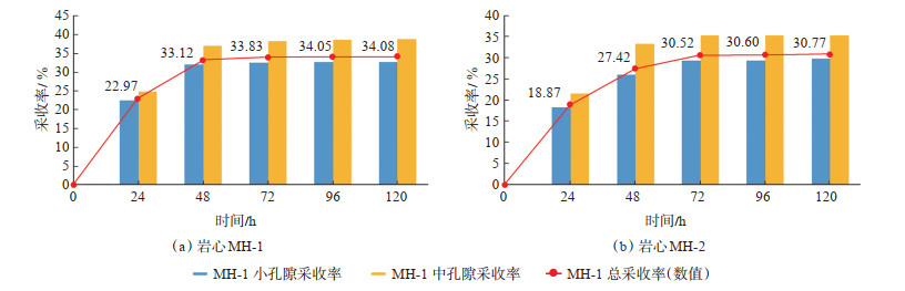 通过称重数据校正核磁共振油相信号,并量化孔隙渗吸采收率实验数据分析结果如图 3所示。
