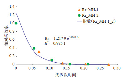 使用上述模型对玛湖低渗砾岩岩心渗吸实验数据进行拟合,MH-1和MH-2这2块岩心渗吸实验数据均较符合MA指数模型规律(图 4)。