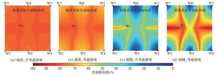 油藏模拟开发5 a后,对比油相平面分布图(图 6)可以看出,渗吸效应对裂缝和基质系统的开发均具有重要影响,渗吸效应促进了基质系统中油相的采出,但却使裂缝系统中的剩余油有所增加,采收率有所降低。其原因为:一方面裂缝-基质间的窜流增加了水相的孔隙体积;另一方面渗吸排出到裂缝的油相增加了裂缝含油饱和度和裂缝中水相的流动阻力。这2个原因共同作用减弱了水相在裂缝中的窜流速度,从而造成裂缝系统采收率降低。
