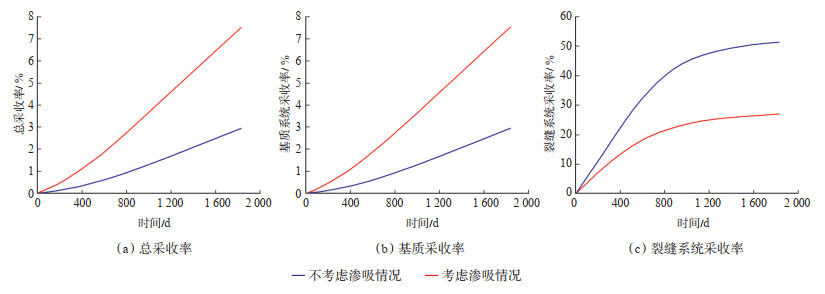 (3)使用得到的渗吸输运函数对交换方程进行表征,改进了双孔、双渗模型,并模拟研究了渗吸效应对水平井开发的影响。渗吸效应使裂缝采收率降低了24.3%,基质采收率提高了4.6%,使整个油藏采收率提高了2.0%。