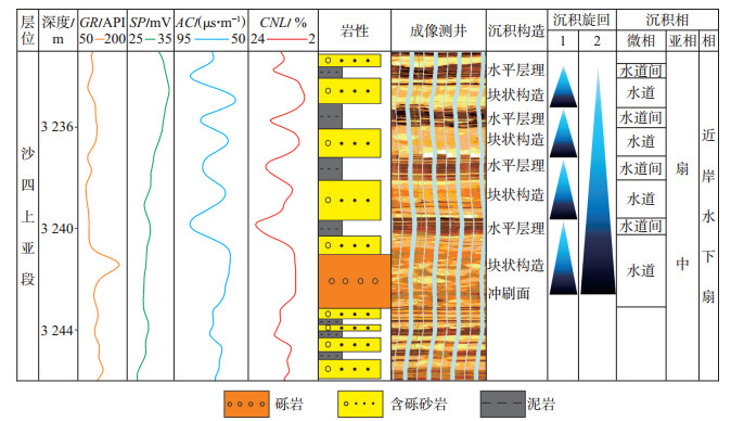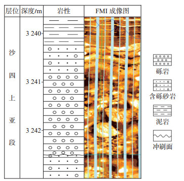 1.1.1 基于岩心、成像、测井资料识别沉积期次界面岩心作为最直观的地质资料,可用来识别岩性、构造等特殊的地质现象,对沉积期次界面反映也较为直观,如典型的岩性突变界面、冲刷面等,这是砂砾岩期次划分的基础,但受限于取心成本较高,不可能完全通过岩心去研究沉积期次,可通过岩心刻度FMI图像和常规测井曲线来进一步加以研究。FMI成像测井具有高分辨率、大信息量以及更精确、更直观的图像表示方式,可反映多种地质现象,一定程度上可替代岩心观察,实现“图像”与“岩相”的转换[14]。图 1为东营凹陷北部陡坡带Y920井3 239.5~3 243.0 m的一段FMI图像,其底部为一个明显的冲刷界面,可作为一个旋回界面,向上粒度逐渐变细,直至过渡到顶部水平层理的泥岩层段,是一个基本的沉积旋回单元。垂向上,多个这样有序组合的基本沉积单元叠覆构成一个尺度更大的沉积期次,这是沉积期次划分的基础。