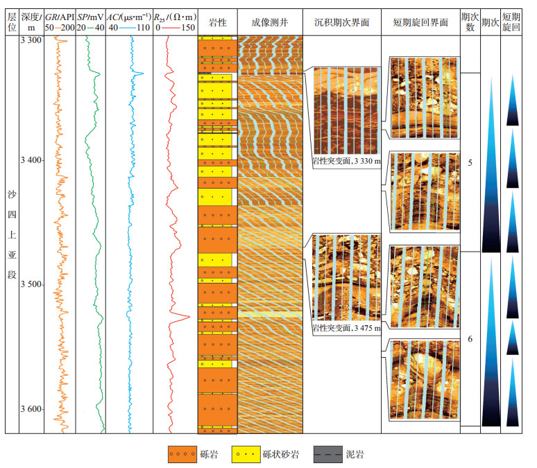 基于FMI “图像”与“岩相”的相互转换,结合常规测井曲线变化趋势,依据上述划分准则,可对研究区的沉积期次界面进行初步识别。图 2为东营凹陷北部陡坡带Y920井3 300~3 600 m沉积期次和短期旋回的划分结果。