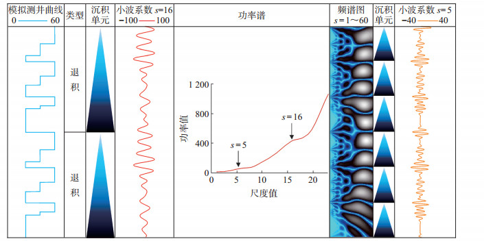 下载原图 图 4 模拟曲线小波变换及功率谱识别沉积期次界面 Fig. 4 Wavelet transform of simulated curve and power spectrum for identifying sedimentary cycle interface |