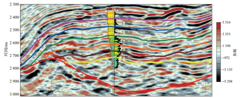 图 5为东营凹陷北部陡坡带Y920区块沙四上亚段东西向的地震切片,可通过识别同相轴来找到反射界面,但由于砂砾岩体地层地震资料分辨率较低,及砂砾岩体本身岩性变化不明显及强非均质性特征,导致沉积体内部结构反射性杂乱,反射界面不明显,同相轴连续性很差,给沉积期次界面的识别带来了较大的困难,可见,单独采用地震资料进行沉积期次界面的识别具有一定的难度。通常,在单井沉积期划分的基础上,以三维地震为约束,采用井-震结合的方式识别期次界面。以研究区Y920井为例,将单井期次划分结果通过合成地震记录将其标定在地震剖面上(图 5),并寻找与之对应的同相轴界面,在地震剖面中追踪沉积期次界面。