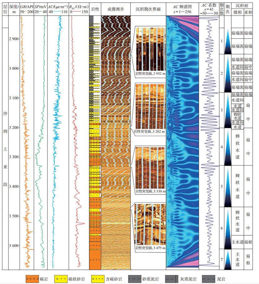 利用岩心、FMI图像、常规测井曲线寻找不同尺度沉积期次界面处的响应特征,再结合声波测井曲线小波变换和功率谱的沉积界面定量识别方法完成单井沉积期次的划分,在此基础上利用合成地震记录以井-震结合的方式进行区域内沉积期次界面追踪,最终将研究区砂砾岩扇体划分为8个沉积期次。以Y920井为例,其底部未钻穿沙四上亚段,单井上可识别出7个沉积期次(图 6)。