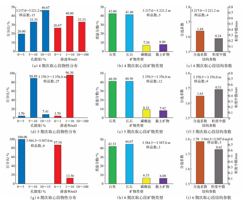统计各取心段样品物性分布、X射线衍射矿物组分含量和结构参数特征(图 8)表明:4期次的取心段主要分布在沉积期次的上部,岩性以含砾砂岩和砾状砂岩为主,含油性显示以油浸、油斑为主,孔隙度主要为10.0%~15.0%,渗透率主要为1.0~10.0 mD[图 8(a)],岩矿组分中石英、长石、碳酸盐矿物和黏土矿物质量分数分别约为42.60%,41.40%,7.20%和8.00%[图 8(b)],颗粒的分选系数约为1.64,粒度中值约为0.24 mm[图 8(c)];5期次取心段主要分布在沉积期次的中上部,岩性以砾状砂岩和细砾岩为主,细砾岩含油性以油斑为主,砾状砂岩以油浸为主,孔隙度主要为5.0%~10.0%,渗透率主要为1.0~10.0 mD[图 8(d)],岩矿组分中石英和长石质量分数都约为40.50%,碳酸盐矿物和黏土矿物质量分数分别约为8.33%和7.92%[图 8(e)],颗粒的分选系数约为1.65,粒度中值约为0.51 mm[图 8(f)];6期次取心段分布在沉积期次的下部,岩性以砾岩为主,无油气显示,孔隙度主要为0~5.0%,渗透率主要为0~1.0 mD[图 8(g)],岩矿组分中石英质量分数约为42.33%,长石质量分数略高,约为44.67%,碳酸盐矿物和黏土矿物质量分数分别约为6.33%和6.00%[图 8(h)],颗粒的分选系数约为1.78,粒度中值约为0.62 mm[图 8(i)]。可以看出,不同沉积期次不同位置地层的物性特征具有较大差异。4,5期次的中上部,岩性以含砾砂岩和砾状砂岩为主,颗粒分选较好、粒度相对较细,物性相对较好,而6期次底部以砾岩为主,颗粒分选差、粒度粗,物性较差。对于4,5期次的含砾砂和砾状砂岩来说,石英和长石含量差异较小,4期次上部取心段碳酸盐含量相对5期次来说较低,会使其物性相对好一些。